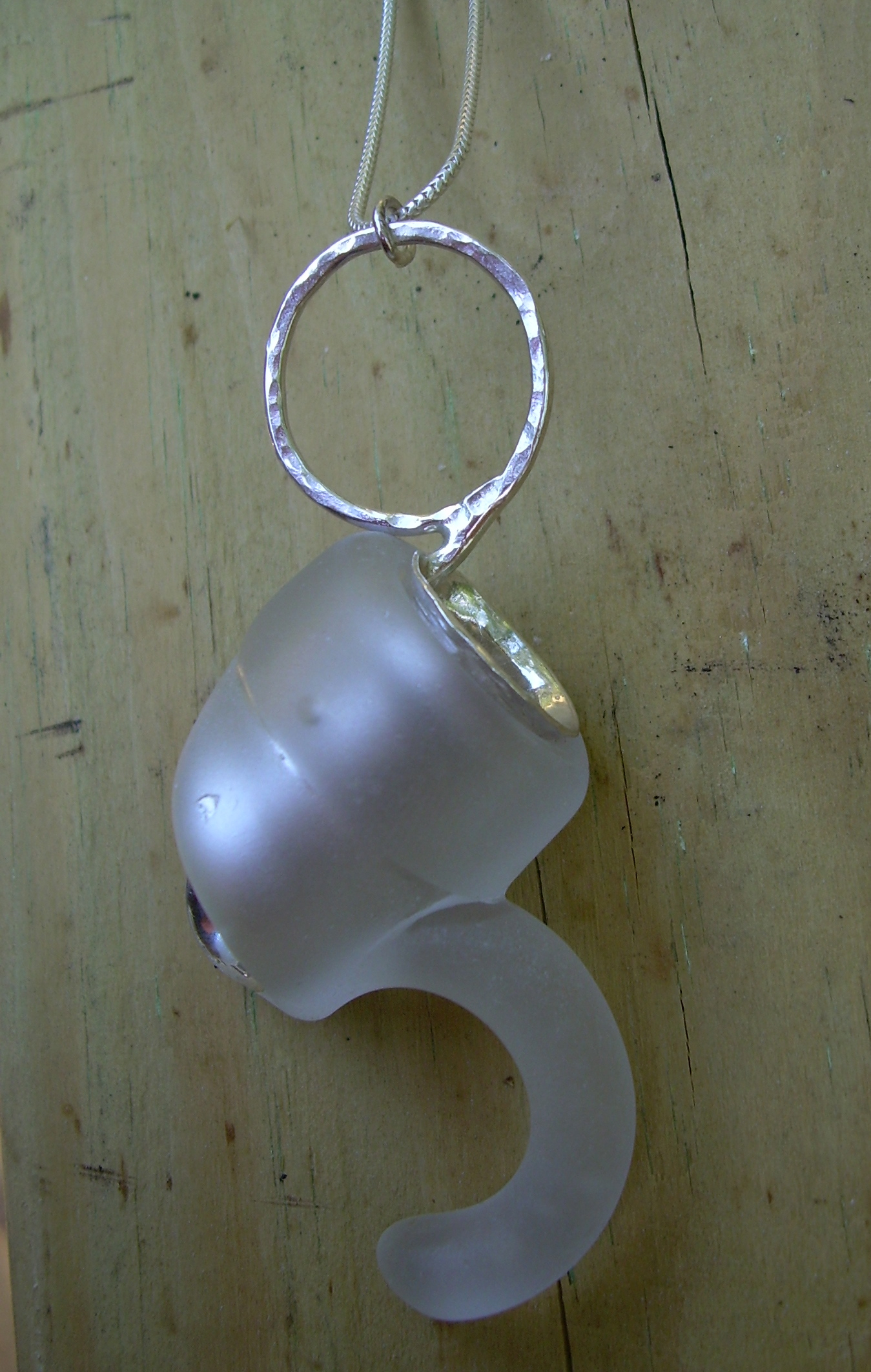 Ultimately the beach comes to an end just after the entrance from Alewive Brook Rd. There is an old rusty wire fence and a spit of sand marking the entrance to Alewive Brook. A great spot for canoes and kayaks. Sea glass finds from Mile Hill beach and a necklace/pendent produced with one curious bottle neck piece of glass: