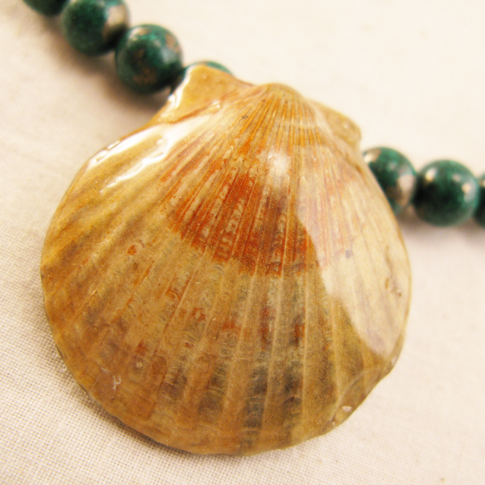 (c ) if you follow the North facing beach of this spit of land facing Gardiner’s bay, you can walk along the beach for 2-3 miles going east. An alternative is to leave you car at the end of Old House Landing Road and then walk west on the beach. This beach is beautiful. It is about 20-30 yards wide. There is lots of sand and a few rocky spots. There are bluffs up to 50 feet high. There is low traffic and but a few beachcombers or dog walkers. Coming from the east, the beach is at first lined by private residences with staircases coming down the bluffs. One of these homes is owned by P Diddy, another by Donna Karan and one by Sean Combs! There are several sites to track the residences of the local celebrities, but this info needs to be updated every few years. Then there is a long stretch where the beach runs along the north border of Cedar Point County Park. In the Park area, you can walk along a wooded path at the top of the bluff and enjoy beautiful views of the bay. The beach is good for stone hunting and for shells. This is one of the best beaches for scallop shells and channeled whelks, used by Indians to create wampum beads. I guess it could be one reason why the Peconic bay area was named one of the top 10 shelling beaches in the country! Ultimately, going east, this beach leads to Sammy’s beach which is discussed below. Here is a necklace with a scallop from Cedar Point: