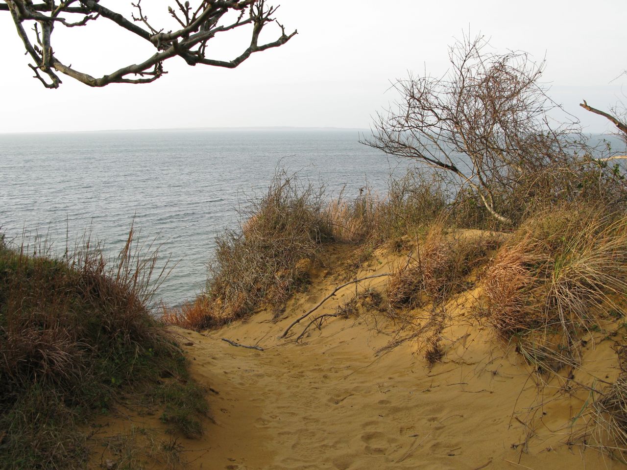 The large amounts of drift wood represent a gold mine for some, like Carolyn Munaco Gaines, an artist from Hampton Bays who paints on drift wood. She tells me that she has taken her kayaks to the beach to load them up with drift wood, since the place is so inaccessible to vehicles. I was thinking of constructing a dog sled and using our German Shepherd (with boundless energy), but we will have to wait for snow fall! There is some beach glass. In terms of shells we found some intact whelks (knobbed whelks and channeled whelks), but that is probably just because there are so few visitors that come to this beach. Because of the large rocks, the eastern end of the beach is not reachable by all terrain vehicles and you will have to walk! When you reach Rocky Point I highly recommend that you return using the Paumanok path (also called Stephen Talkhouse Path in this section) which winds its way along the ridge of the bluffs with beautiful views of Napeague Bay and Block Island Sound. Note the stunted oak trees on the bluff, that are short and kneaded because of the salty winds. Some of the tree trunks are covered with sand from the dunes and most of the trunk ends up being under ground. On our last visit we saw a red tailed hawk(common in this area).