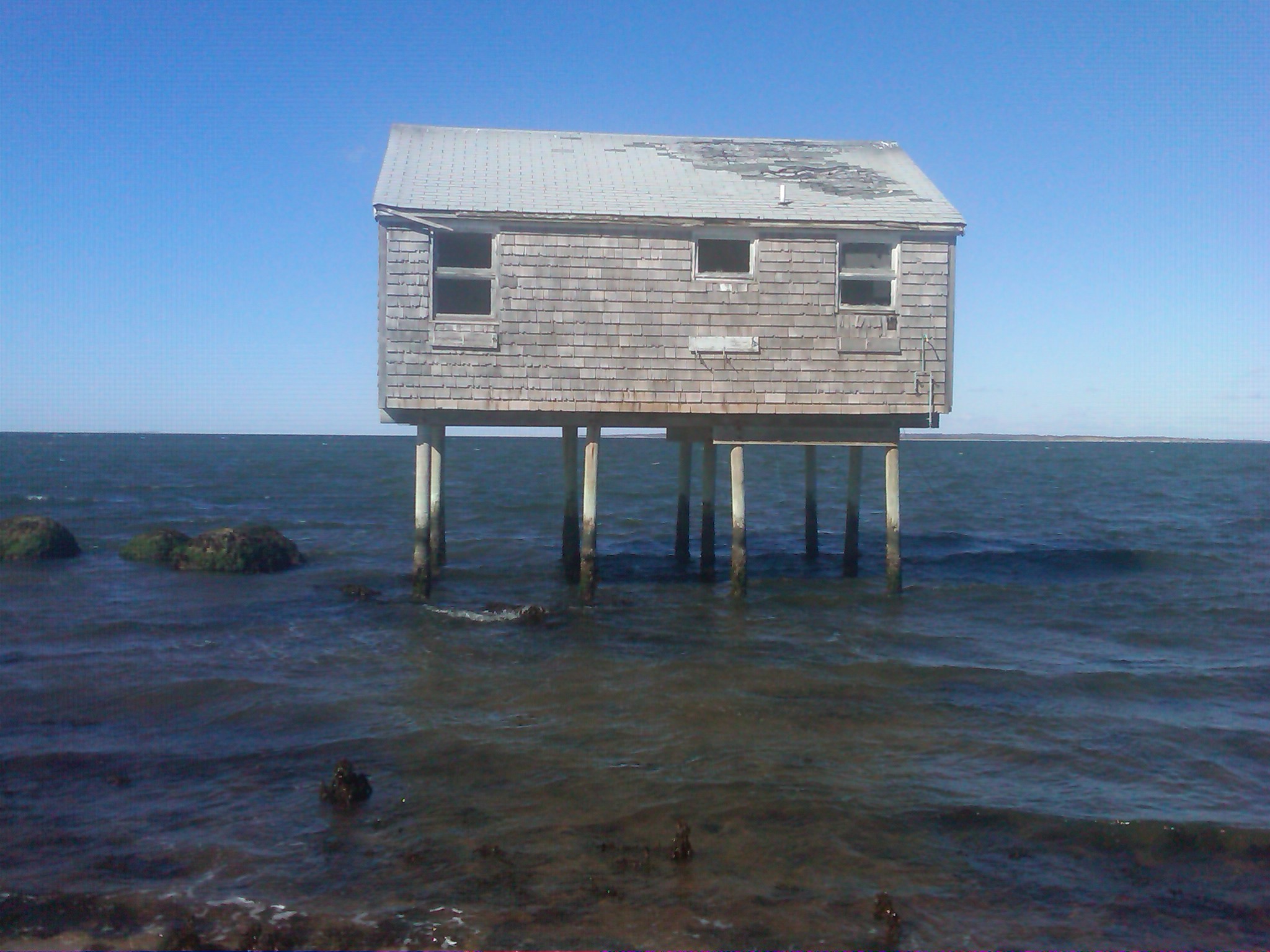 After the Devon Yacht Club there follows a long stretch of beach facing Napeague Bay to the north. It is very difficult to find access to this beach. The road is called Lazy Point Rd or Cranberry Hole Rd. Your best bet is to leave your car somewhere near Lazy Point at the eastern end of the road, where there are several small parking areas. There is a small community of homes by the beach, called Napeague. Carl Safina lives here. He is an author and an ocean scientist and ecologist of national fame. If you walk west along the beach, in the general direction you came from while driving to Lazy Point, you can walk for 4 miles (one way). It is a long walk but the athlete Kevin Joseph swam along this beach the entire way! This is NOT an easily accessible beach and there are a number of obstacles, but it is well worth you while. At first you will have to navigate some erosion barriers which is sometimes not possible at high tide, as the homes are built close to the water. One abandoned house on stilts is really in the water! This is a favorite hang out for the local photographer John Todaro who has taken beautiful pictures of the house on stilts.