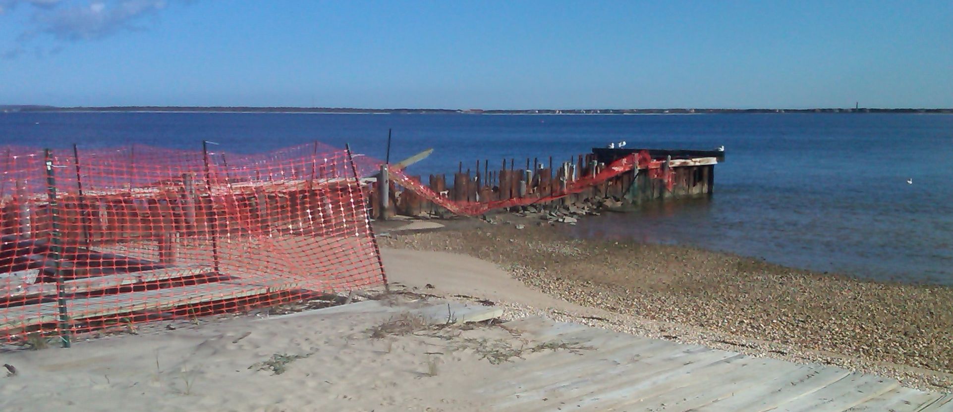 This is a continuation of the Kings point – Louse Point beach. It is reachable via Barnes Hole Rd. The beach faces Napeague Bay to the east. Starting at Barnes Landing and walking south you will soon reach the remains of a pier belonging to the famous Bell Estate. The estate was a 500 acre beach front property in its hay day, but it is now subdivided. Dennistoun Bell built the dock in 1931 after giving the East Hampton Town Trustees land near Fresh Pond for a park in exchange for the beach in front of his property, reaching from Albert’s Landing to Barnes Hole Road. The dock, which is now in shallow water, was in water deep enough for Bell’s 70-foot-long yacht. The property was developed after Reginald Lewis bought it for approximately $4 million in 1988. Three years later Dr. Bell’s mansion, Broadview, burned to the ground. All that remains of its original grandeur is the dock and a covered stairway, from the bluff to the beach. Neighbors are still arguing about the future of old Bell pier, while experts disagree on whether it causes or hinders erosion.