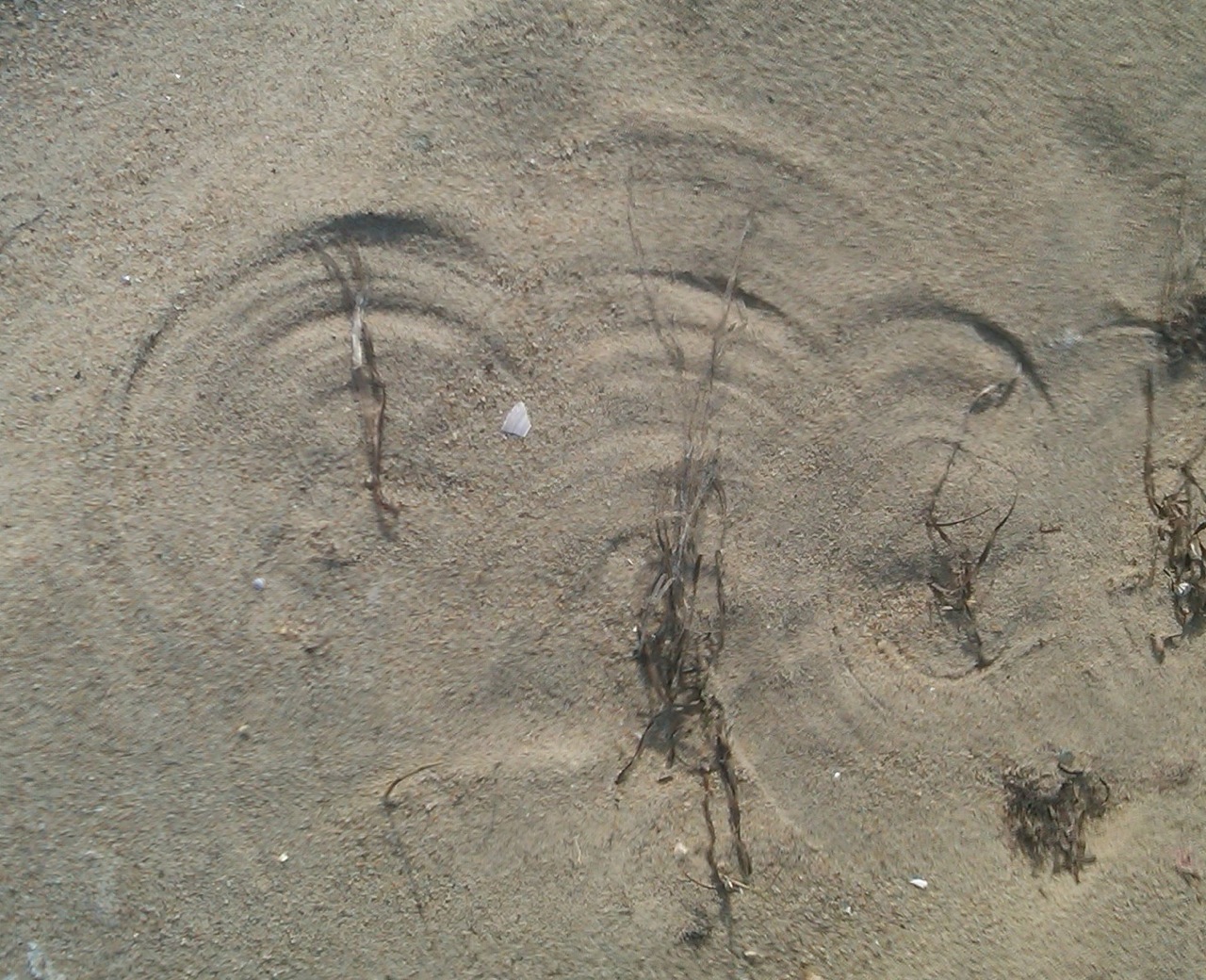 This is not a beach for bathing and there are few rocks, shells or sea glass. We recently walked this beach on a windy day with swirls of wind coming from different directions. As a result the “beach grass” (Ammophila Brevilugata or American Beachgrass) which is anchored in the sand was blown around in circles creating interesting round patterns in the sand – I call them “wind shield wipers”.