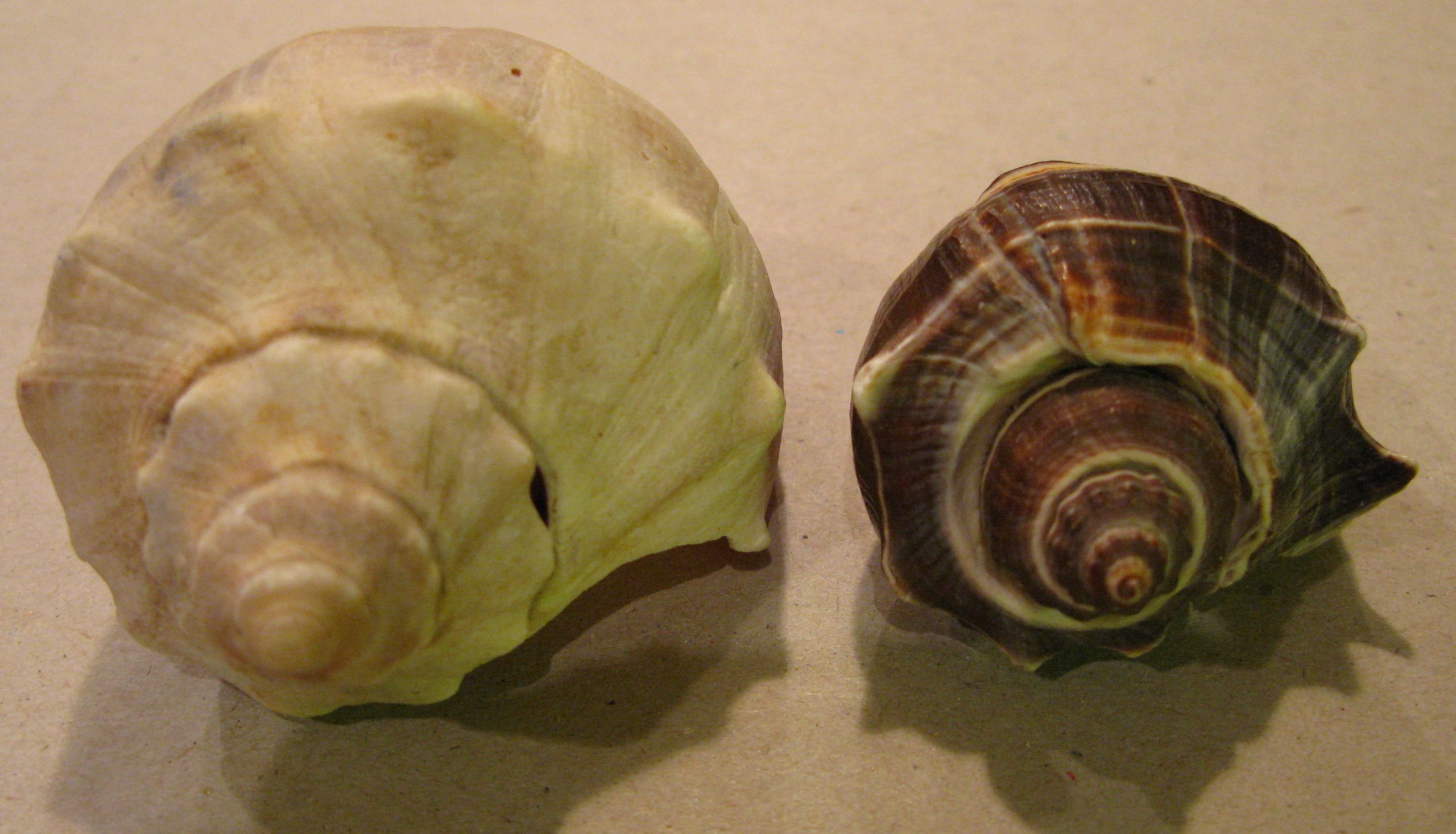 If you are walking the beach and searching for treasures you can find the occasional sand dollar (look at this cool video) or other interesting shell. Last time I was there, I found some whelks on this beach, but they were not the usual knobbed or channeled whelks that we see on the bay beaches. These were common whelks. There are 4 main whelk species on our shores: common whelk, channeled whelk, knobbed whelk and lightening whelk. I have added some pictures. I have yet to find a lightening whelk. They are coiled sinistral (clockwise) while all the other species are dextral (anti-clockwise). These are interesting carnivorous animals with a highly developed sense of smell for both their prey and their predators. They are edible and in many countries, like Japan, they are considered a delicacy.