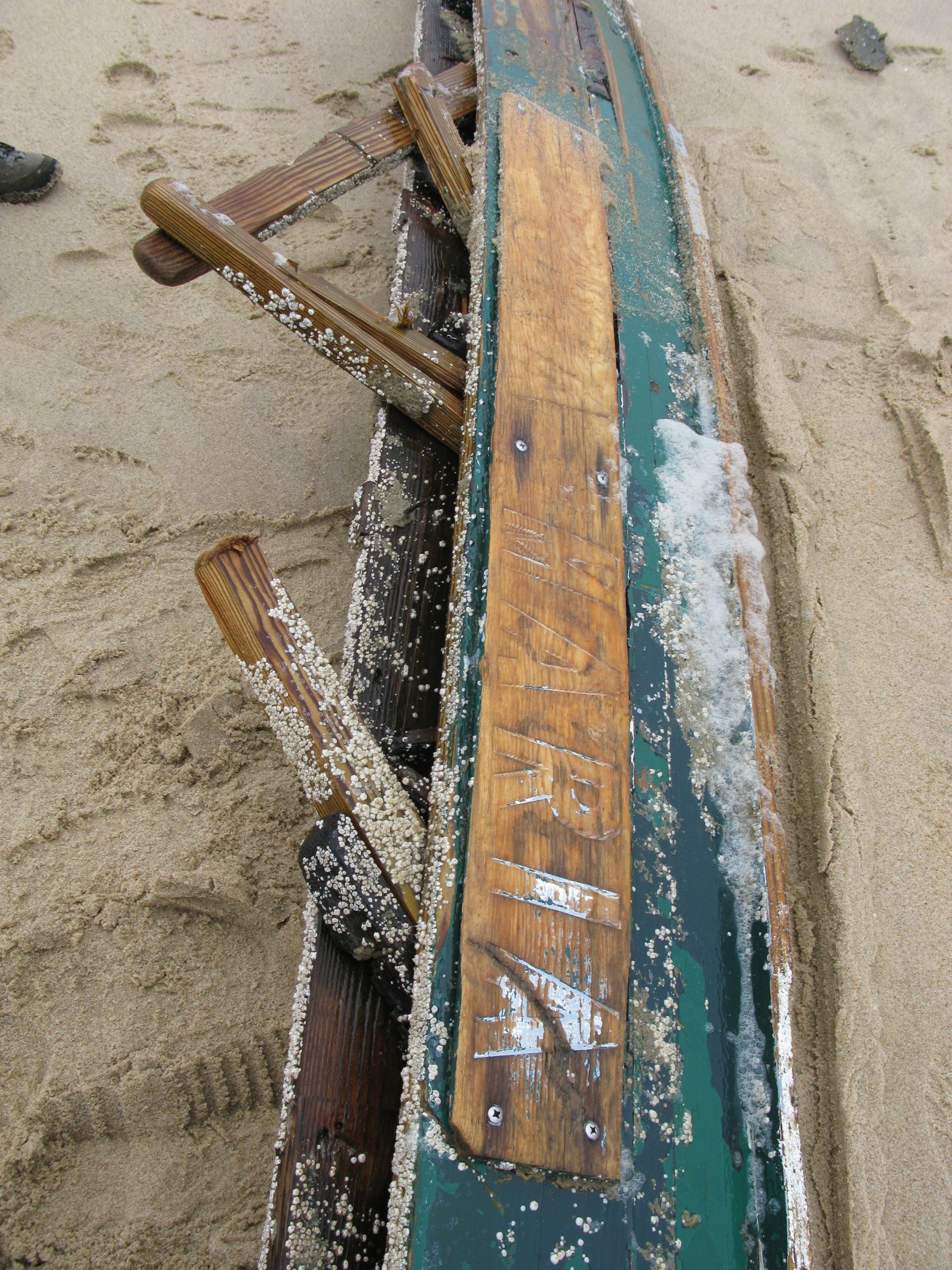It measured easily 10 feet across and it was heavy, but my wife and I were able to turn it over to see the name of the boat etched on the back of the transom. We could make out __ORA MARIA or perhaps __URA MARIA. I then searched the internet for shipwrecks with names like SENORA MARIA, DORA MARIA or LAURA MARIA. I could not find anything. As you can see the paint color of the boat was teal and the name was in white paint. I will post more on this when the mystery is solved!