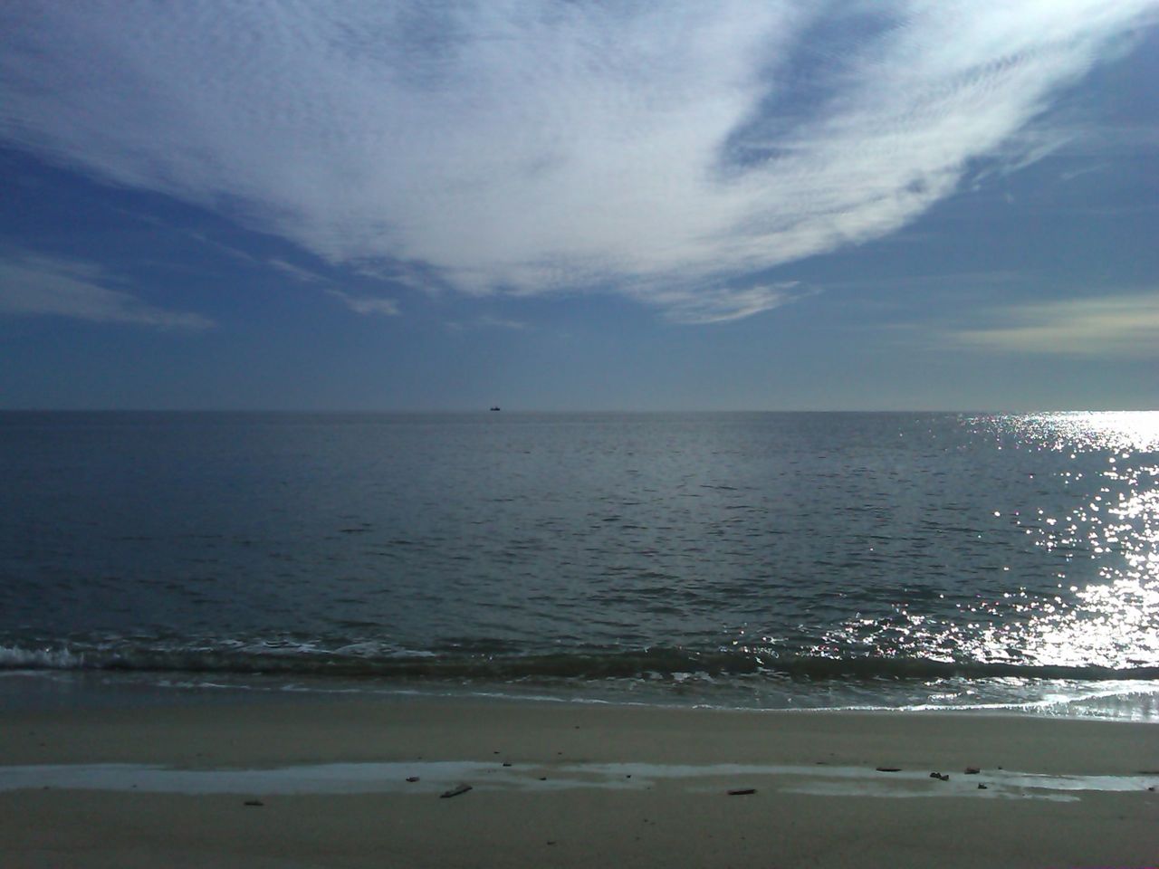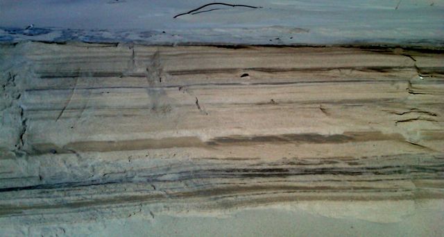 shells and blackened jingle shells, black moon shells and other shells. I have noted the black color of jingle shells elsewhere on this blog. I am quite sure that this color is acquired, as the shells settle in black mud at the bottom of the ocean. Only miles away, on the bay beaches, the blackened shells are quite rare. You can see areas of blackened sand too. And where the tides have eroded the beach, you will see layers of sand with alternating black versus light colored sand (see picture).