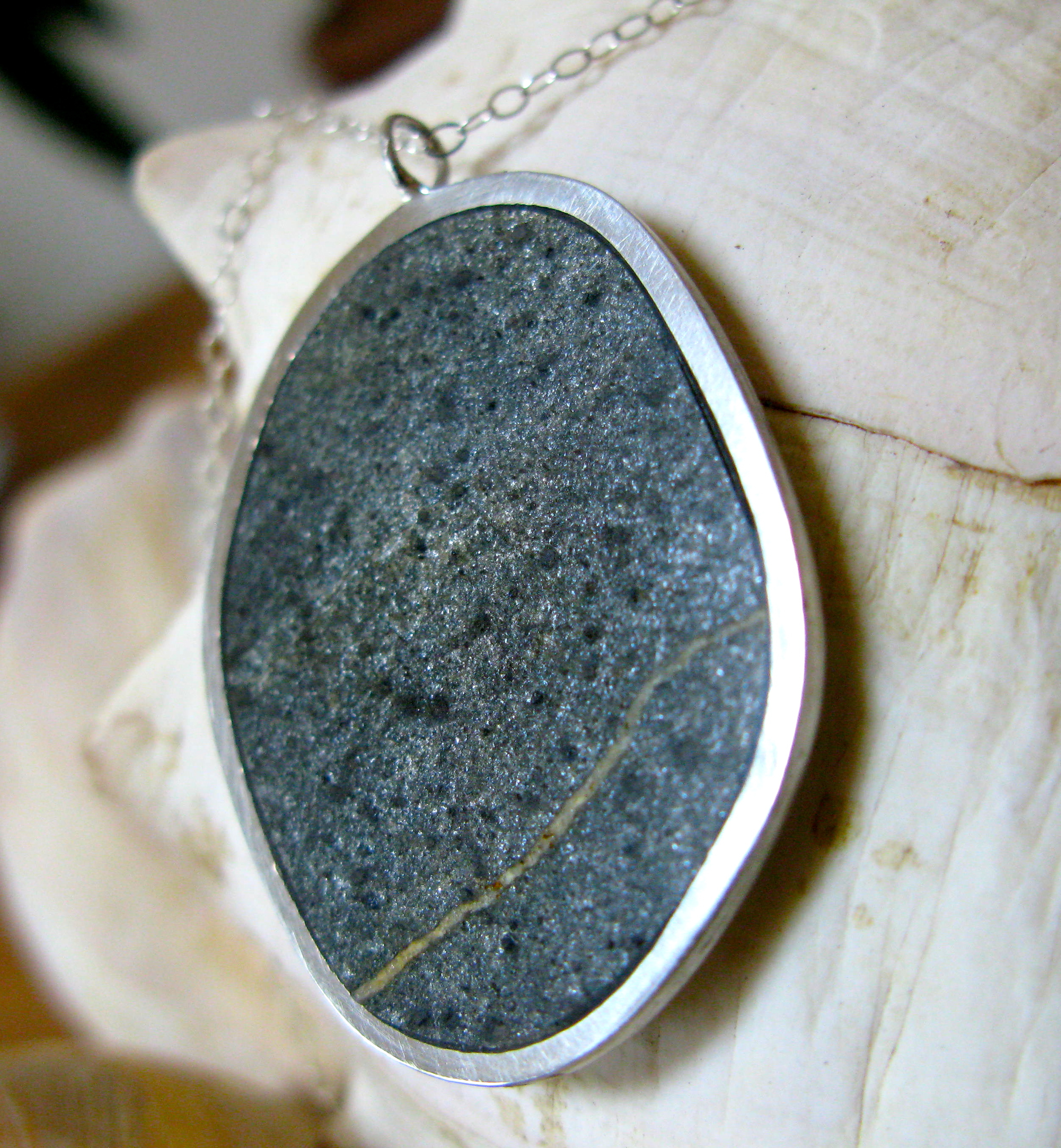 A flat stone from our beach, sliced and polished, set in a very thin silver bezel on a delicate chain.