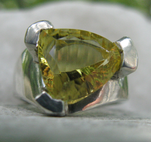 This is a Brazilian natural citrine (not heat-treated). It is a gorgeous cut, a trillion of sorts, but deep and with many facets on the belly side. Its got a lot of sparkle. The setting and the ring are asymmetrical just like the stone. Its interesting that the camera focused on the bottom of the stone!